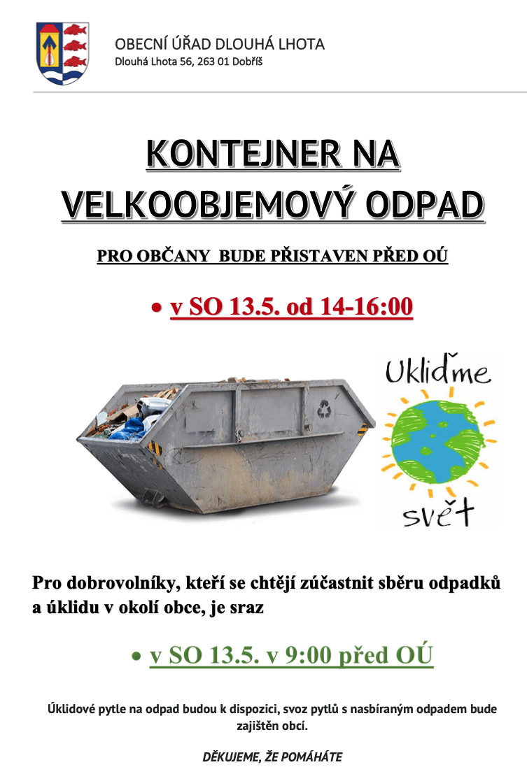 Kontejner na velkoobjemový odpad pro občany bude přistaven v SOBOTU 13.5.2023 od 14 - 16:00 hodin.
